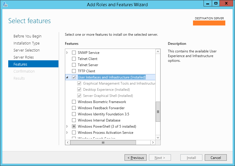 05. select features -> “User interface and infrastructure”,”Desktop Experience” -> next